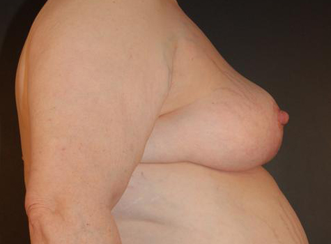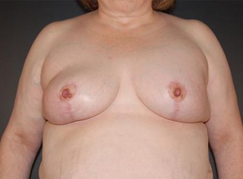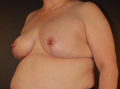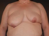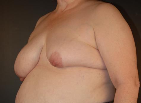 This 56year-old patient has a severe asymmetry and is here regarding her wishes to have a breast lift and augmentation. She wishes to enhance her breast size and improve the shape and symmetry of her breasts. She is 5’7 in height and 220 pounds. I performed a mastopexy and breast augmentation using subpectoral implant placement with 500cc moderate plus profile, smooth, saline implant on the left and breast reduction on the right.