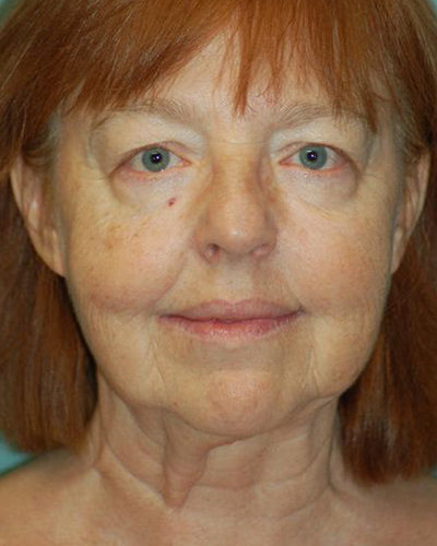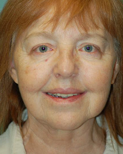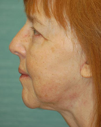 Facial combination procedures are increasingly common as people want to correct several signs of aging at once. My goal was to gently lift and tighten much of the thin, excess skin that hung below her chin and neck, most noticeable in her profile “before” picture. I carefully sculpted the skin and tissues to create a more defined-looking neck, and performed blepharoplasty, or eyelid surgery, both above and below her eyes to tighten her excess tissues and give her eyes better definition compared to the overall shape of her face.