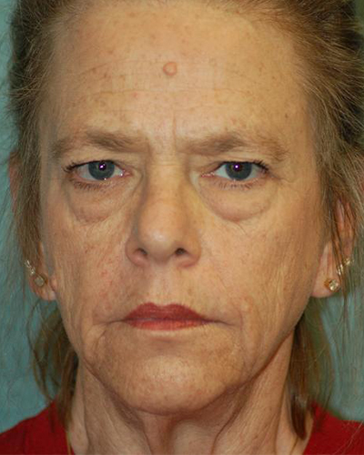 This woman was unhappy with the drooping, empty bags under her eyes. She was also unhappy with the way the soft tissues in her mid-face and neck had begun to sag over time. To find out how plastic surgery in Las Vegas could correct these signs of aging, she made an appointment with me. After she described her goals and I explained some of the options that could address her concerns most effectively, we settled on a combination surgery that would involve a facelift, brow lift, and surgery for both her upper and lower eyelids.